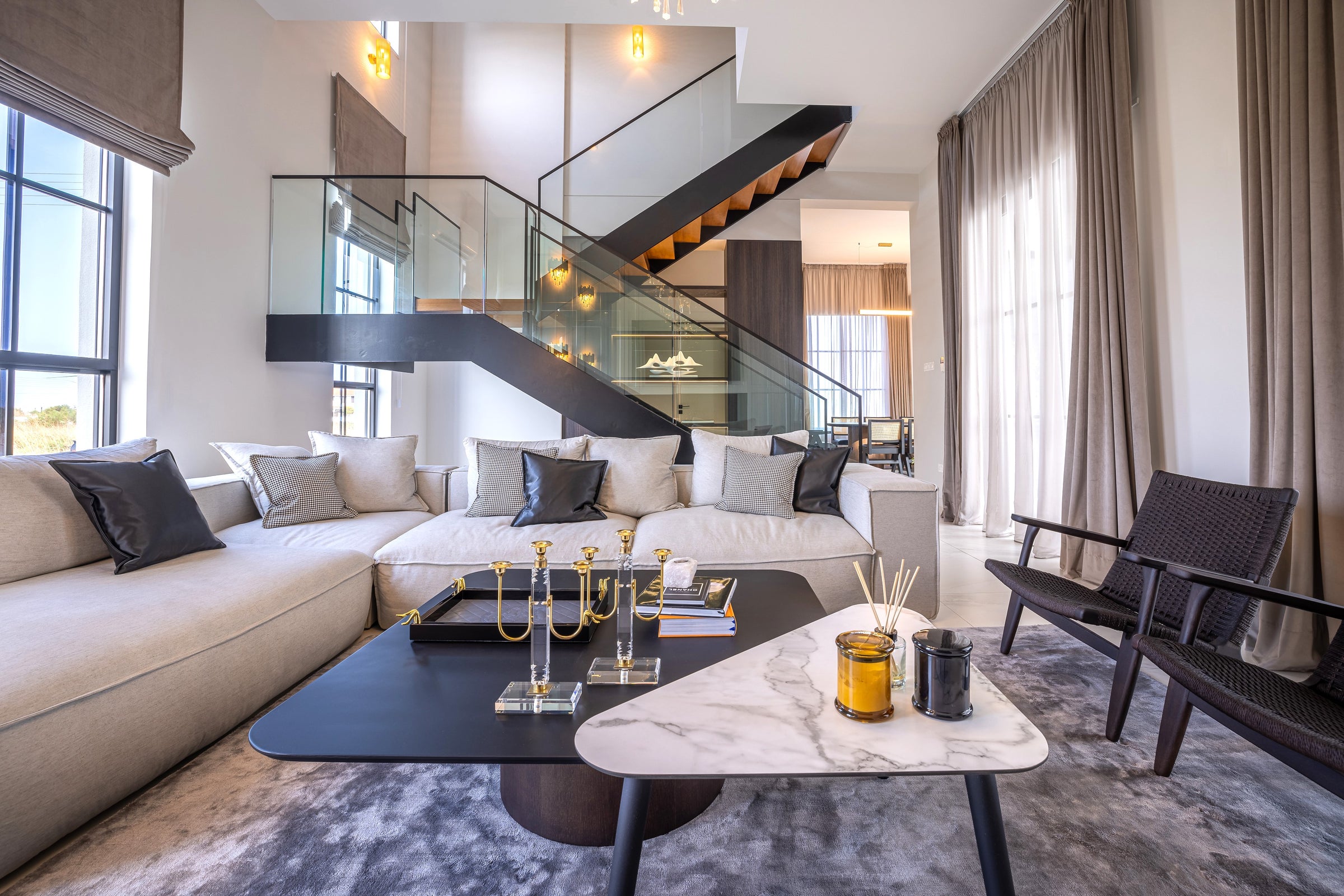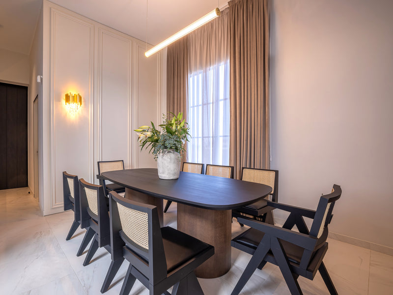 A beautiful and elegant residential project featuring the AZOR sofa, OSCAR lounge chairs in black, CARACAS and MAYORKA dining chairs.