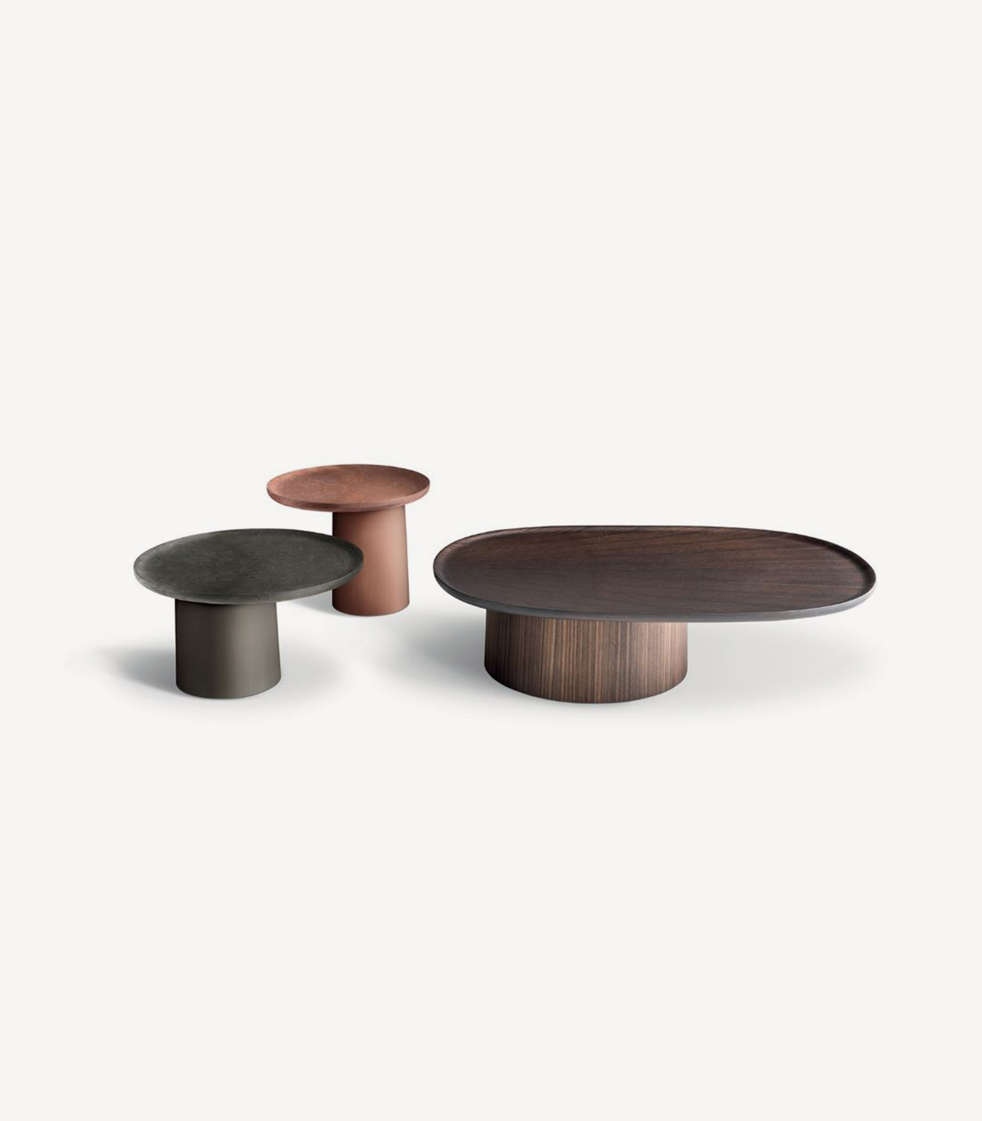 This set of round and oval coffee tables blends modern elegance with natural warmth. Contrasting colors and the visible grain of solid oak create a striking aesthetic, while the versatile design allows the tables to enhance a variety of interior settings.