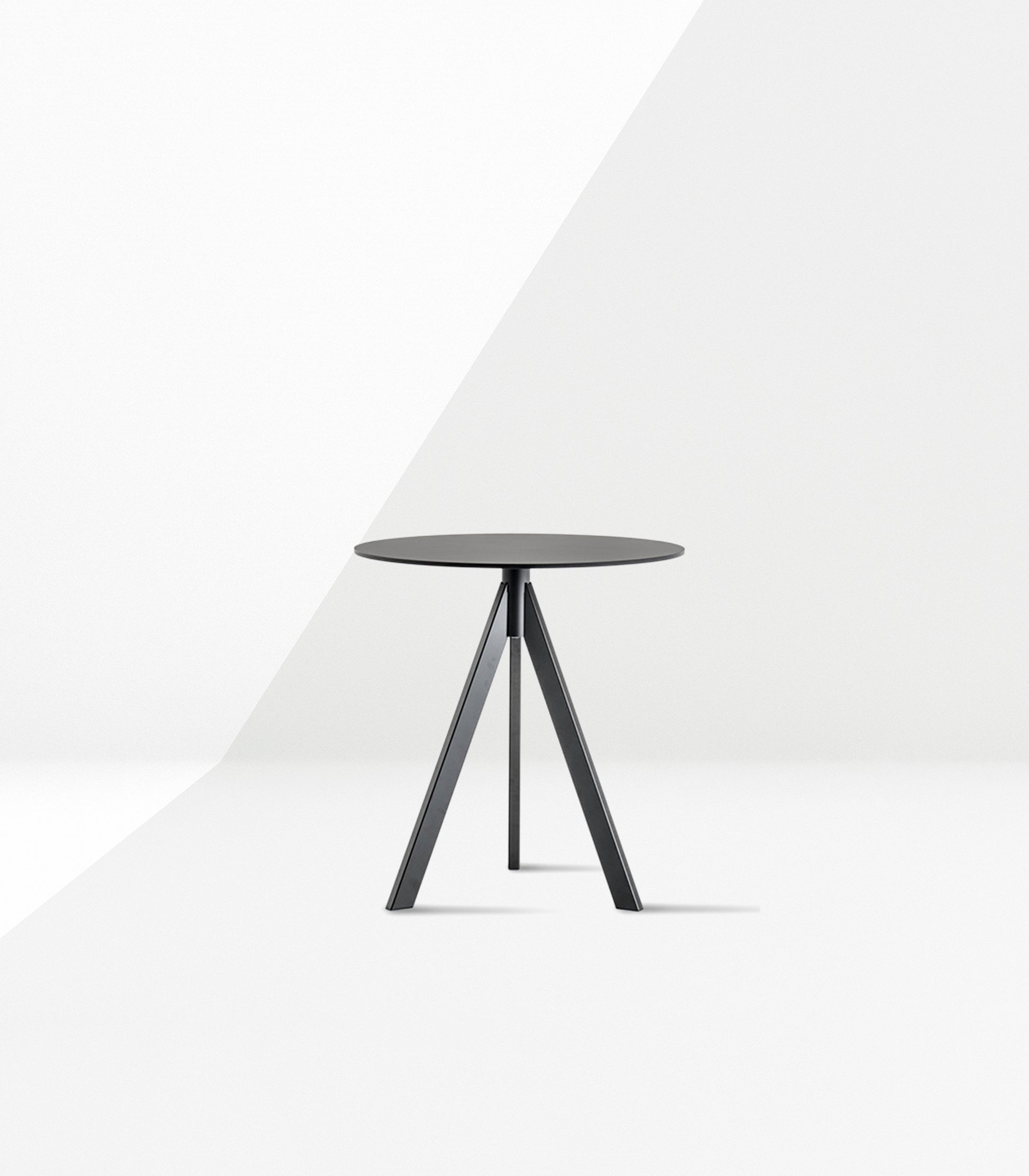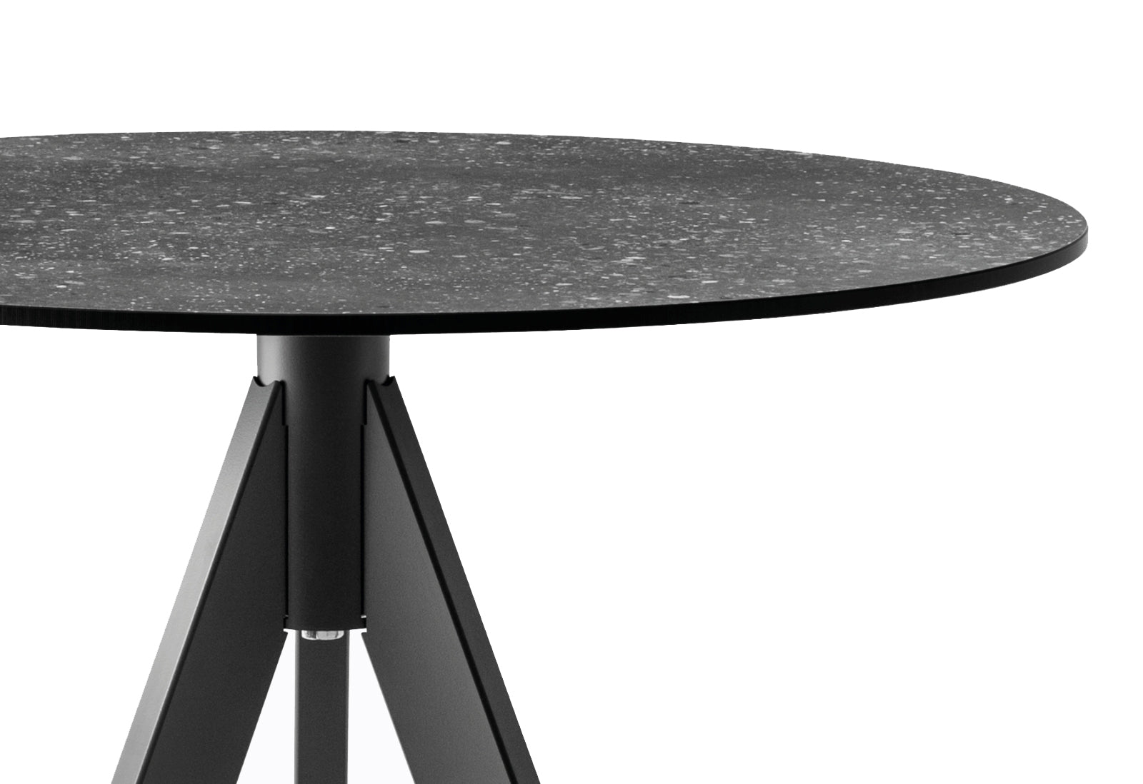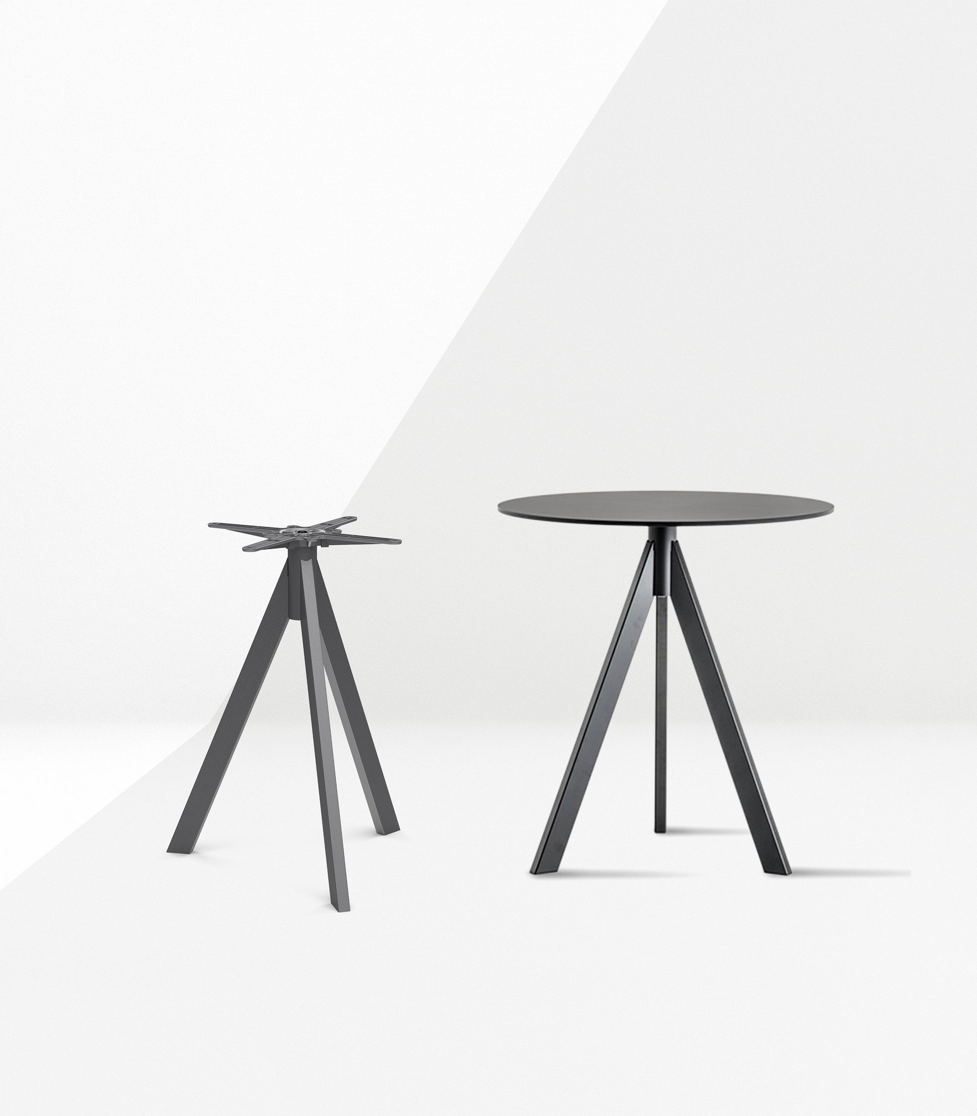 Featuring a powder-coated steel frame in anthracite, this base showcases a minimal, contemporary splayed three-leg design. Durable and refined, it pairs effortlessly with HPL or solid wood tabletops, providing a clean, modern foundation for versatile settings.