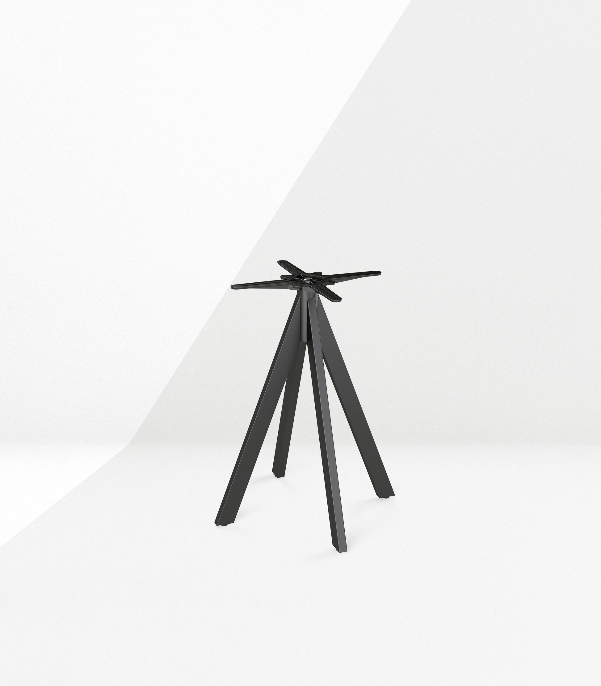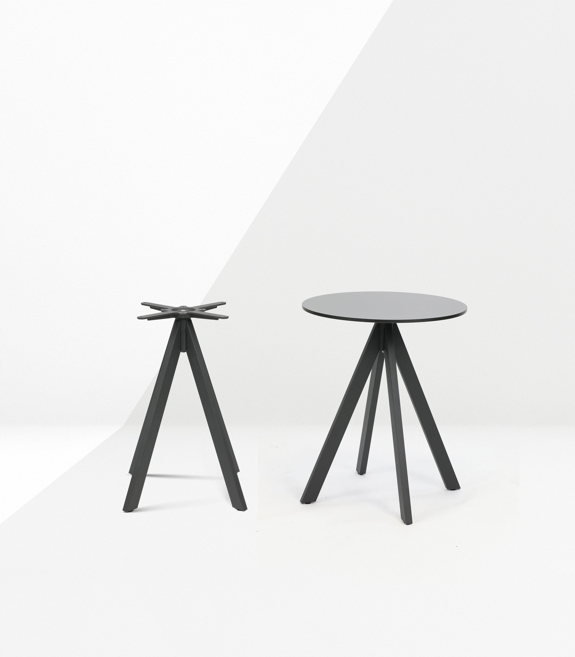 Featuring a powder-coated steel frame in anthracite, this base showcases a contemporary splayed four-leg design. Durable and refined, it pairs ideally with HPL or solid wood tabletops, offering a modern foundation for versatile settings.