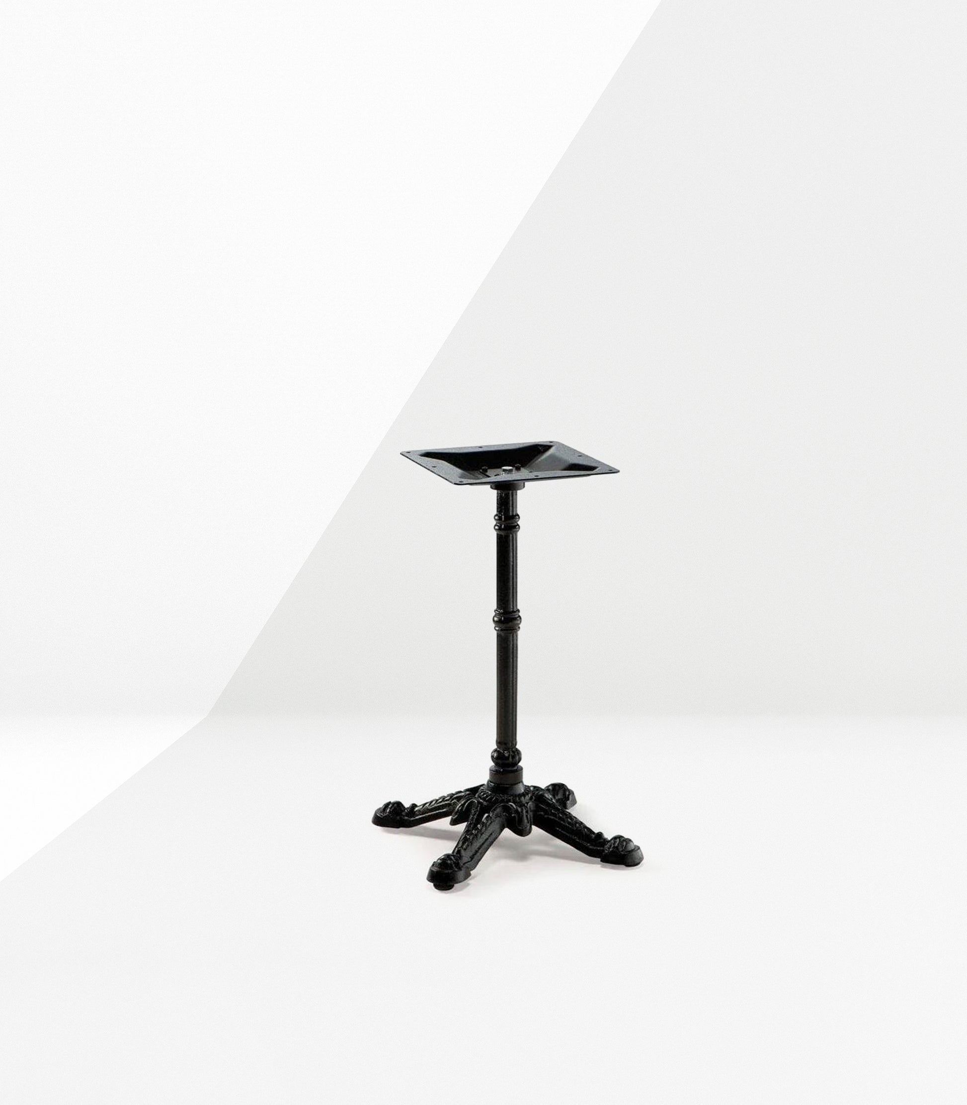This cast-iron ornate base, finished in black varnish, features adjustable feet for stability. Ideal for eclectic commercial settings, indoors or outdoors, it pairs perfectly with solid wood or HPL tabletops, combining durability with timeless style.