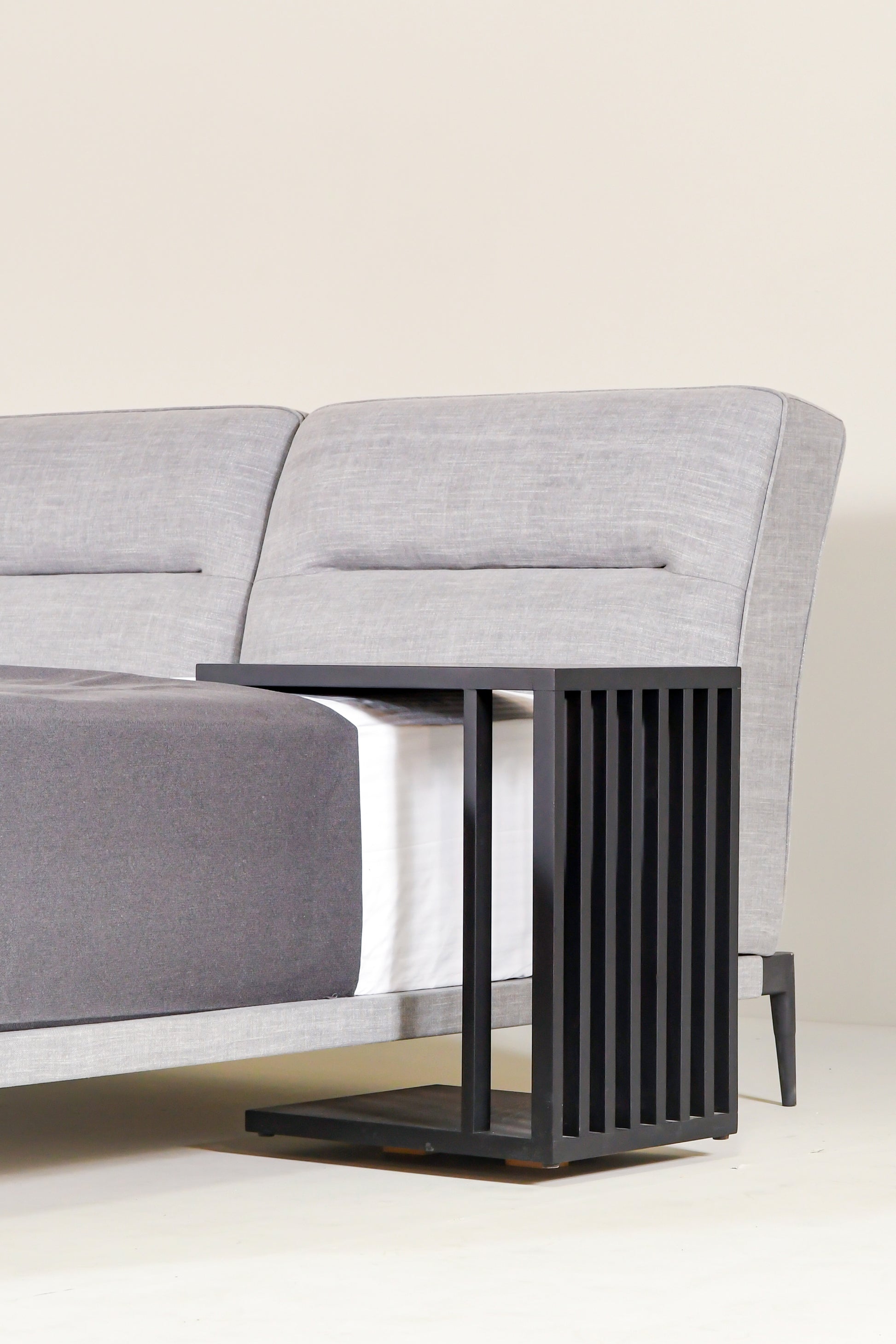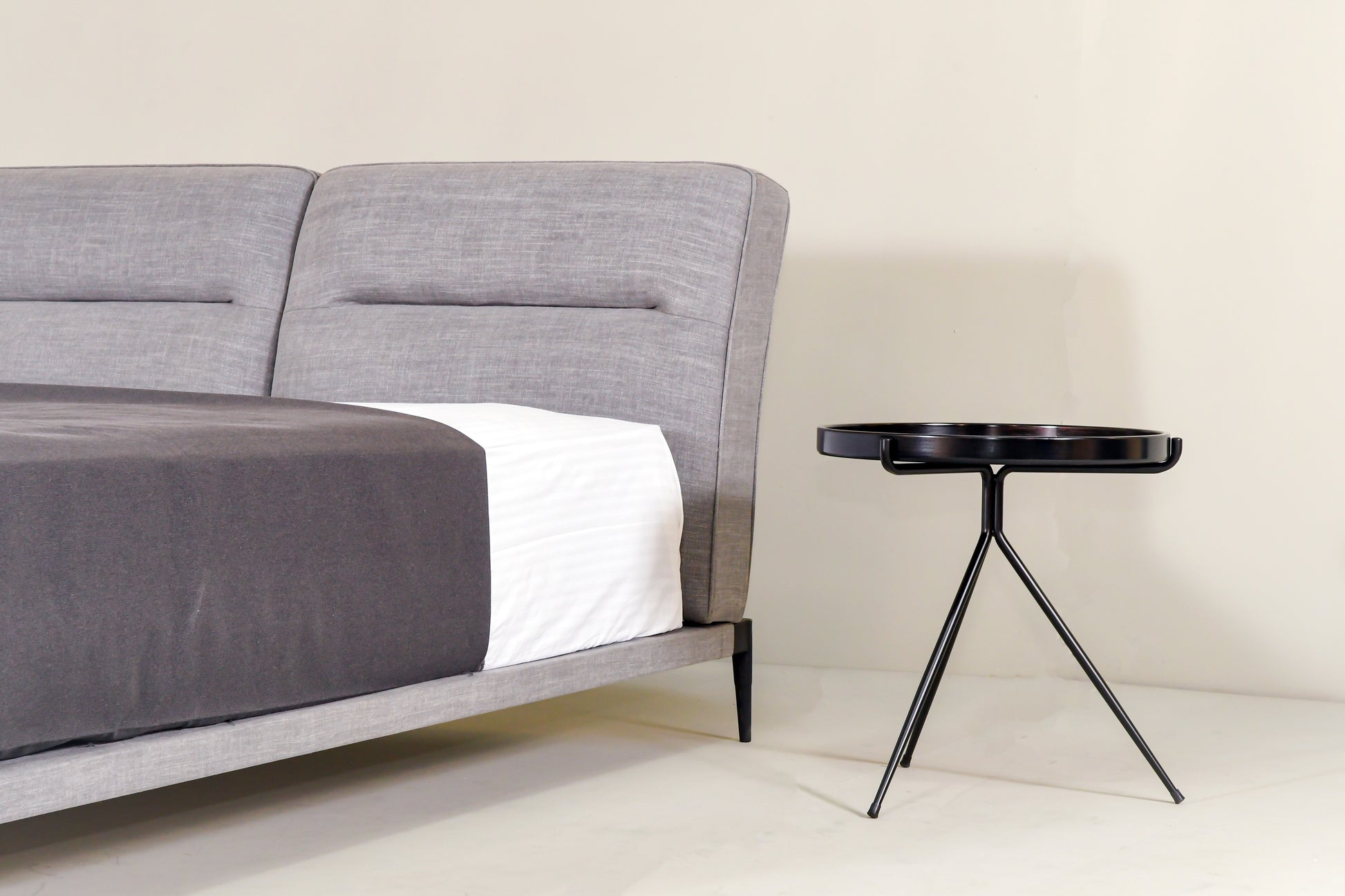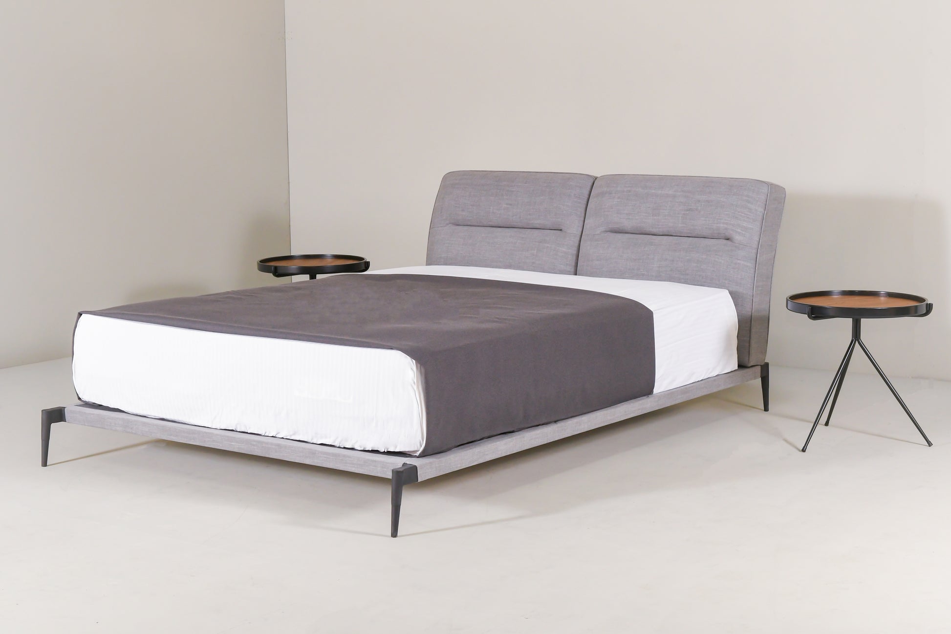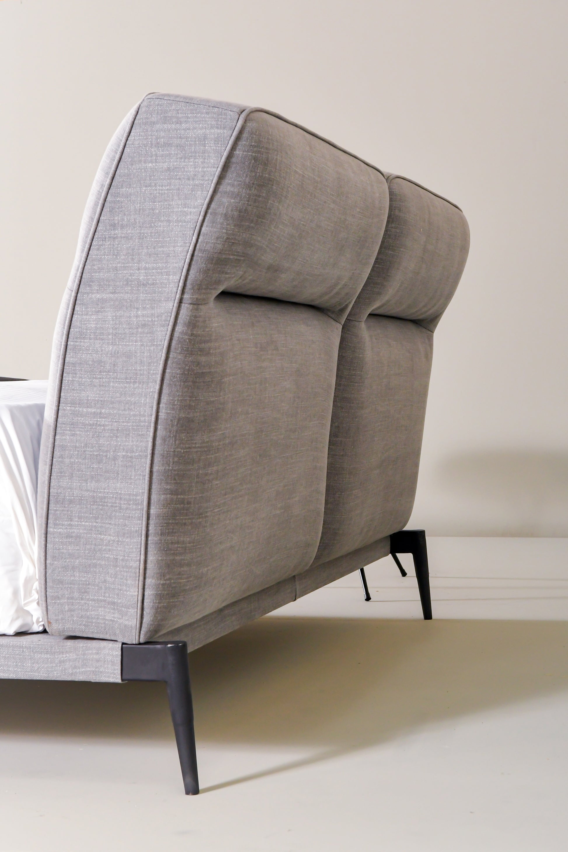 The Hermes bed features a sophisticated design, with a sculptural, dual-volume headboard set on a sleek black steel frame. Fully upholstered in textured fabric and finished on all sides, it makes a striking statement whether wall-mounted or freestanding.