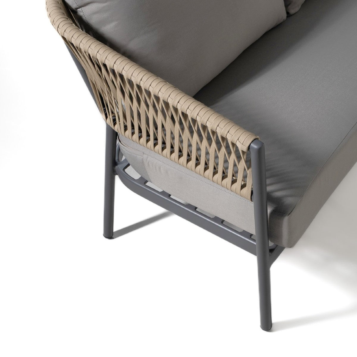 The Portofino sofa set blends comfort and style for contemporary outdoor living. Crafted with a sturdy aluminum frame and finished in refined beige rope detailing, it offers lasting durability with an elegant aesthetic. Beige cushions upholstered in water-resistant, easy-clean fabric provide deep, inviting comfort, making the set ideal for patios, terraces, and poolside areas. Designed for relaxation and social gatherings, its timeless neutral palette complements any outdoor setting with effortless sophistication. This set comes with a two seater sofa and two lounges.